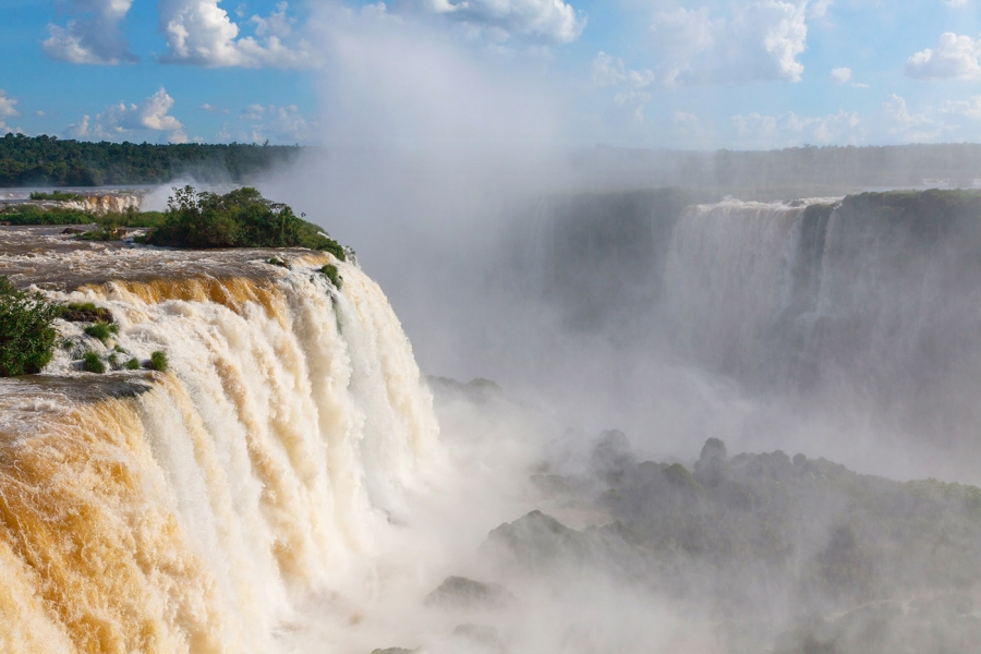 Комплекс из 275 водопадов на реке Игуасу расположен в сердце вечнозелёной субтропической сельвы, на границе Парагвая, Аргентины и Бразилии. Река Игуасу сначала растекается, подтапливая заросшие низким кустарником берега, а потом обрушивается с разных сторон в гигантский провал. Наиболее впечатляющий восьмидесятиметровый каскад называется «Глотка Дьявола». В парке можно провести весь день. Тут есть великое множество дорожек, мостов и смотровых площадок – водопады можно увидеть сверху, сбоку, прогуляться над ними, и полностью промокнуть, прокатившись на катере под водопадом.