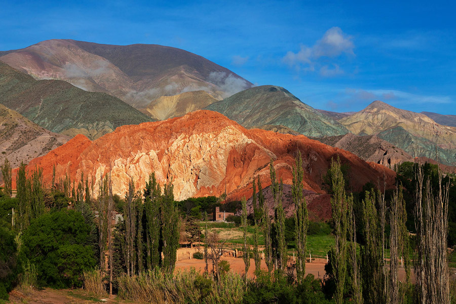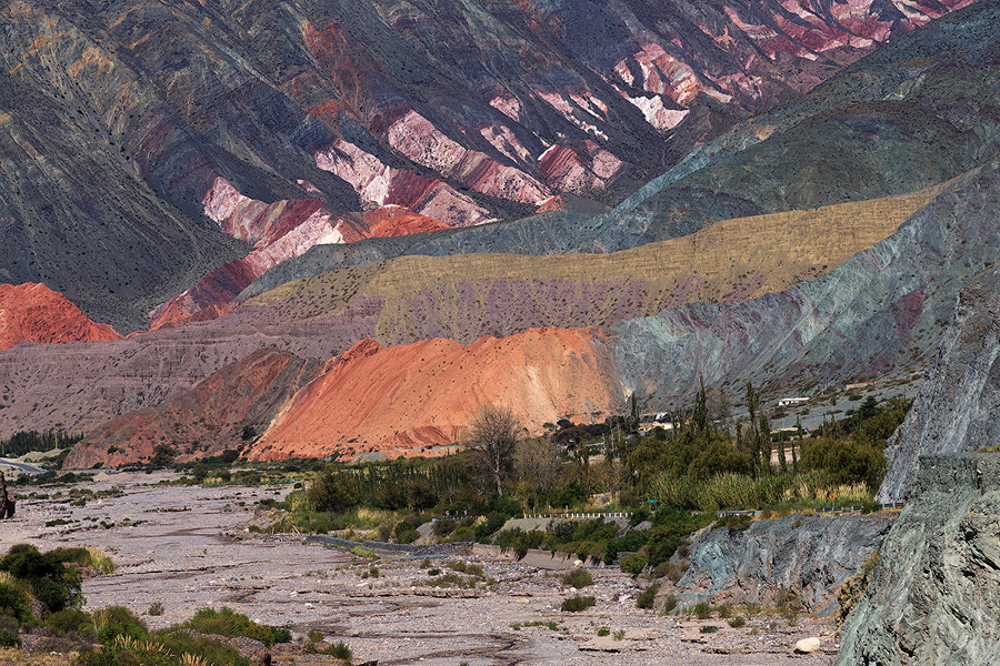 Наша цель на сегодня – место под названием Purmamarca (расстояние от аэропорта 65 км) . Это небольшая деревня с населением всего 500 человек, расположенная на высоте больше 2 000 метров. Горы здесь невероятных оттенков – от песочно-желтого до ярко-вишневого. Самая яркая гора называется Cerro de los Siete Colores (Семицветная гора). Прямо из деревни тропа ведет на высокий холм, сидя на котором, можно встречать закат и наблюдать, как тень опускается на крыши домов.